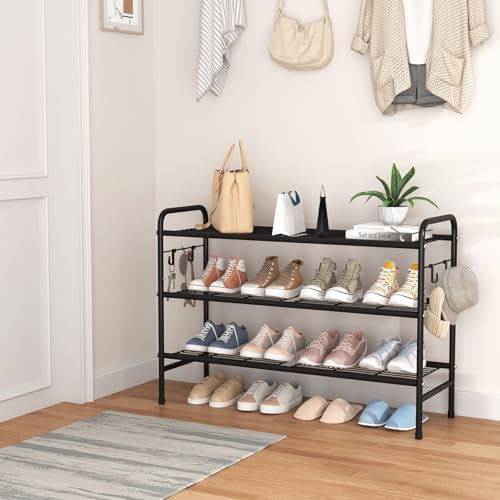 3 Tier Shoe Rack 33″ Wide Metal Shoe Organizer Long Shoe Storage with 4 Side Hooks Sturdy Shoes Shelf for Front Door Entrance, Closet, Garage, Dorm, Black