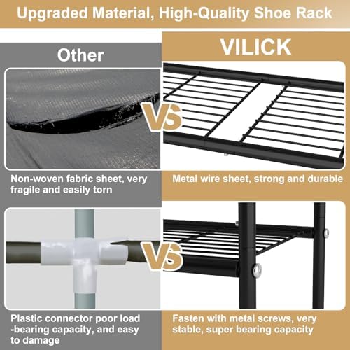 Product description VILICK 3 Tier Metal Shoe Rack for Front Door Entrance, Closet, Garage Keep Your Shoes Organized Sturdy & Durable Shoe Rack Sturdy Metal Frame Durable Metal Grid Shelf Four Side Hooks Anti-Slip Leg Cover Easy to Assemble For Entryway For Bedroom For Garage There’s Always One Shoe Rack