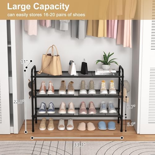 3 Tiers Shoe Rack Organizer – The shoe shelf (33.1″W x 11″D x 22.8″H) can store 16-20 pairs of shoes, including adult shoes, children’s shoes, sneakers, casual shoes, boots, etc. Additional bottom storage for daily flats and slippers.