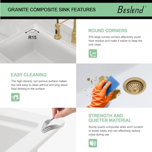 Quieter & Easier to Clean: This white composite kitchen sink with thick material has a natural noise and vibration dampening effect, can effectively reduce the sound caused by the sink when it is in use. R15 rounded corners and slightly sloped bottom will help the sink clean and drain better