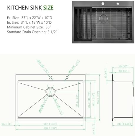 Sink Dimension & Package: Exterior: 33″(L) x 22″(W) x 10″(H); Interior: 31″(L) x 18″(W)x 10″(H). Cutout Size: 32″(L) x 21″(W); Min.: 36”; Standard Drain Hole: 3 1/2”. The black single bowl kitchen sink comes with a range of accessories including a wooden cutting board, colander, drying rack, bottom grid and basket strainer drain, mounting clips and installation instruction, providing convenience and efficiency.