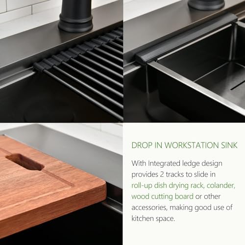 Functional Workstation Design: The workstation design allows to slide various accessories such as solid wood cutting board, black colander, roll-up dish drying rack, saving workspace and keeping the kitchen tidy. 10 inch deep kitchen sink is very conducive to soaking and cleaning large kitchen utensils such as baking trays and stockpots.