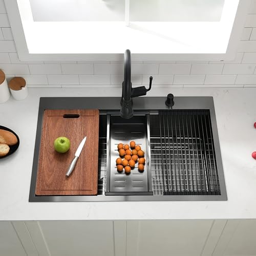 Durable & Long-lasting: Made of 16 gauge thickness stainless steel material, the 33 inch black drop in kitchen sink offers excellent corrosion resistance and wear resistance. It is not easily deformed or damaged, maintaining a good appearance and functionality over 10 years. Additionally, the black nano-PVD surface is corrosion-resistant, wear-resistant, and rust-proof and stain-resistance giving the sink a stylish and sleek look.