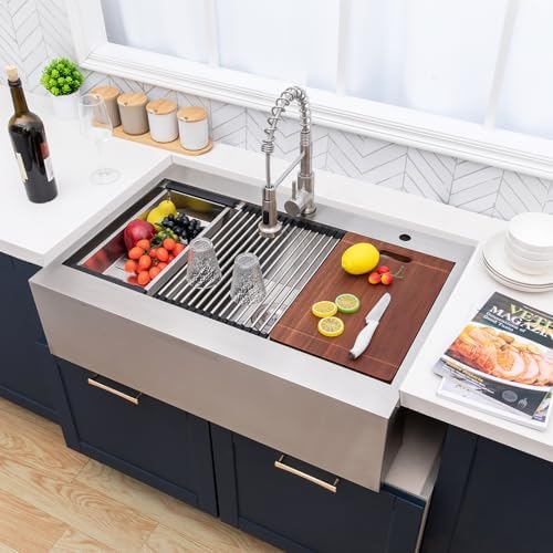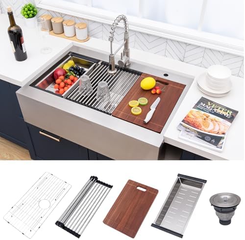 33 Inch Farmhouse Sink, 33″ x 22″ x 9″ Stainless Steel 9 Inch Deep Single Bowl Apron Handmade 16 Gauge Undermount Kitchen Farm Sink with Integrated Workstation Ledge and Accessories