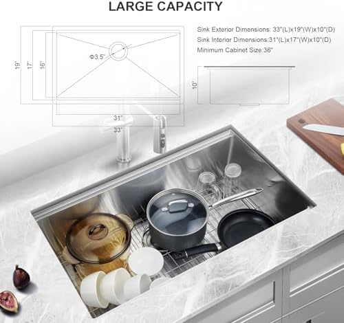 Sink Kitchen Dimensions & Package: Exterior dimensions: 33″ W x 19″ D; Interior dimensions: 31″ W x 17″ D x 10″ H. Minimum cabinet size: 36”. Includes: under mount sink kitchen, solid wood cutting board, roll-up drying rack, stainless steel colander, bottom rinse grid, drain strainer assembly, mounting hardware, cutout template, and installation guide