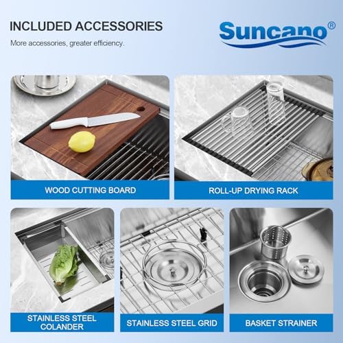 Suncano workstation sinks feature a brushed finish and are constructed from 18-gauge type 304 stainless steel. Designed to resist heavy bumps and scratches, these kitchen sinks not only facilitate dish cleaning but also serve as a versatile workstation for meal preparation.