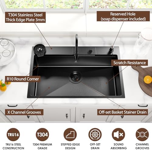 33×22 Waterfall Kitchen Sink with Faucet Black Drop in Single Bowl Kitchen Sinks 16 Gauge Stainless Steel Luxury Kitchen Workstation with 8 Accessory Include Glass Rinser and Soap Dispenser
