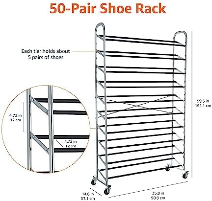Amazon Basics 50-Pair Shoe Rack Organizer 50-pair shoe rack keeps shoes organizedMade of metal with a chrome finish10 tiers to neatly organize your shoesPortable, rolling design with locking wheels; store in your room or closetMeasures 35.8 x 14.6 x 59.5 inches (LxWxH)