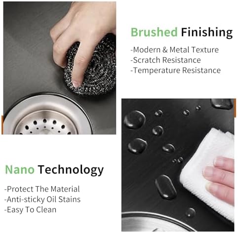 Surface Technology: Brushed finishing and nano technology make topmount kitchen sink resistant to scratches and temperature, repeling water and oil stain makes it easier to clean. Anti-condensation coating prevent water droplets forming. Sound dampening pad reduce noise caused by running water or dishwashing.