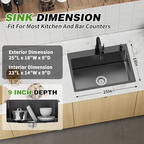 Versatile Compatibility: 25×18 in black kitchen sink can work well with various countertop materials, such as granite, quartz, or marble. Stainless steel kitchen & bar sink complement various kitchen styles and designs. Whether you have a contemporary, traditional, modern kitchen or bar, a stainless steel sink can seamlessly integrate into your aesthetic.