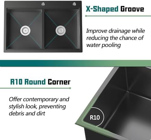 Fast & Complete Drainage: X-shaped groove of topmount double bowl sink facilitates quick drainage, ensuring efficient water flow and preventing pooling. R10 make cleaning easier by reducing accumulation, minimizing effort that maintain a clean workstation sink.