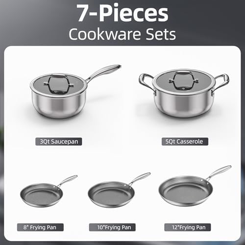 ?Cookware Set includes?: 8-inch Frying Pan, 10-inch Frying Pan, 12-inch Fry pan, 3 QT Saucepan with Tempered Glass Lid, 5 QT casserole pot with tempered glass lid. Premium stainless steel cooking set to look elegant in kitchen.