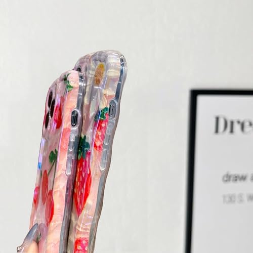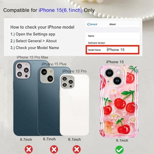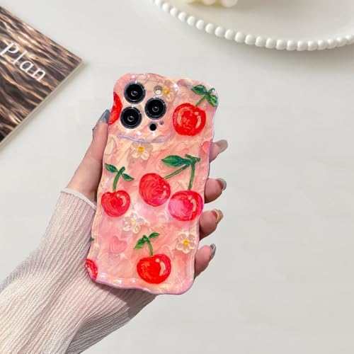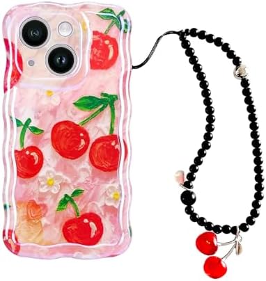 Cute Cherry Case for iPhone 15,Summer Girly Aesthetic Oil Painting Printed Flower Laser Glossy Pattern with Phone Charm,Curly Wave Frame Shockproof Slim Protective Cover for Women 6.1”-Cherry