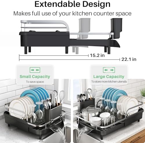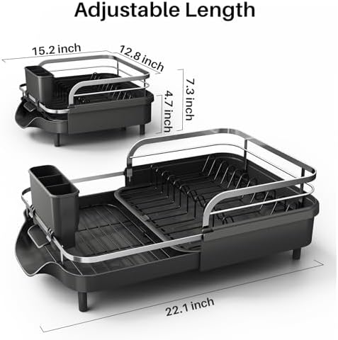 Product description Extendable Design: SNTD’s dish drying rack measures 12.8″ D x 4.7″ H, and the width can be adjusted from 15.2″ to 22.1″, which is suitable for kitchens with limited space. The rack can be extended or retracted to fit your available counter, while it is capable of accommodating