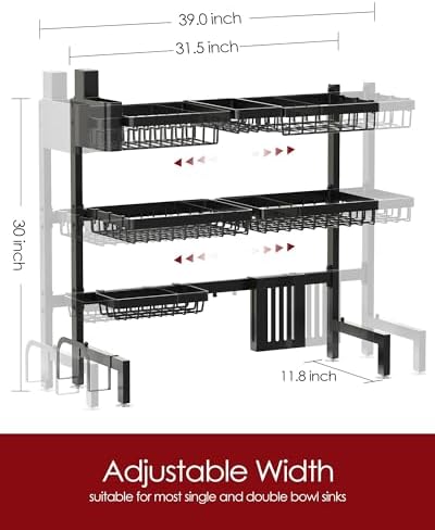 ADJUSTABLE DESIGN: Designed with an adjustable width ranging from 31.5″ to 39.0″, this over-the-sink dish drying rack easily fits a wide range of kitchen sinks. Its flexible sizing ensures a secure fit without sacrificing stability. For the best fit, make sure your sink is less than 39.0″ wide and the faucet is under 21″ high. Please ensure there is at least 42.5″ of vertical space above the countertop to accommodate the rack and dishes.