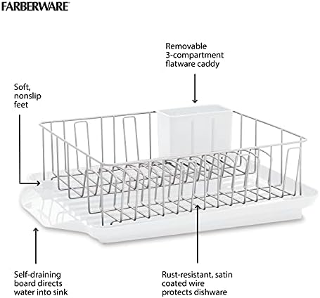 Stay organized and efficient in the kitchen with the Farberware Professional 3-Piece Dish Rack, designed for durability and maximum drying capacity. Crafted from heavy-duty satin powder-coated wires, this rust-resistant dish rack offers a large, high-capacity basket that easily accommodates a wide variety of dinnerware, cookware, and flatware, preventing overcrowding and allowing your dishes to dry quickly and safely. The sturdy wires securely hold plates, bowls, pots, and pans while protecting surfaces from scratches, ensuring your valuable kitchenware stays in excellent condition. Included is a removable caddy with three compartments, perfect for organizing flatware, utensils, and kitchen tools separately, making unloading a breeze. The versatile, self-draining board is also removable, offering extra space for drying large pots, pans, and roasting dishes. Equipped with soft, non-slip feet, the dish rack stays stable on countertops and protects them from scratches and damage. Measuring approximately 16 inches by 14 inches for the basket and 21 inches by 15 inches for the draining mat, this dish rack set combines functionality, durability, and style to meet the needs of busy kitchens. Whether you’re a home cook or an aspiring chef, the Farberware Professional Dish Rack is an essential kitchen companion for efficient dish drying and organization.