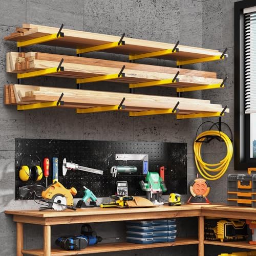 GREENER Lumber Storage Rack Folding Wood Storage Racks Wall-Mounted Metal Racks for Storage with 3-Level Heavy Duty Garage Wood Organizer for Woodworking Shop Indoor & Outdoor Use, 4 pairs,Yellow