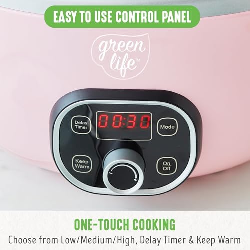 GreenLife 6QT Slow Cooker, Non-Toxic PFAS-Free Ceramic Nonstick Removable Interior Bowl, Programmable, Family Friendly, Keep Warm, Stovetop & Oven Safe, Dishwasher Safe Parts, Timer, Glass Lid, Pink