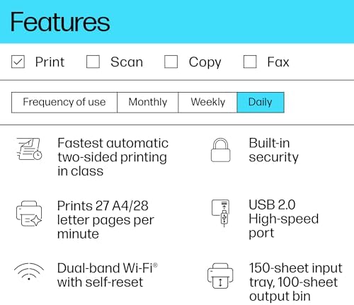 From the brand Find out more Find out more Find out more Find out more Find out more FAST AND RELIABLE WIRELESS LASER PRINTING: The fastest two-sided printing in class. Blazing fast automatic two-sided black and white printing at up to 19/18 (Letter/A4) duplex pages per minuteRELIABLE WI-FI: Performance you