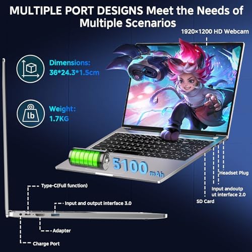 ?16″High-Res Display & Versatile Design?This 16-inch laptop features a 1920×1200 high-resolution screen with a unique 16:10 aspect ratio, adding approximately 10% more vertical display area. That means more document paragraphs on one screen—no constant scrolling, boosting your work efficiency significantly.The 180° flexible hinge lets you adjust the screen angle freely, adapting to various scenarios with ease. It also comes equipped with Wi-Fi 5, BT 4.2, and a range of ports: 1x Type-C, 2x USB 3.0, 1x SD card reader, 1x DC charging port, 1x headphone port, 1x Mini HDMI, and a built-in webcam.