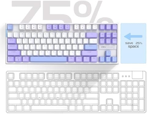 [Ergonomic mechanical keyboards]: stylish white purple mash up 75% layout, come with extra 16 blue keycaps, double-shot injection non-slip suspension keycap, splash-proof design, durable metal panel enough to protect it from scratch, also firm kickstand feet adjustable typing angle.