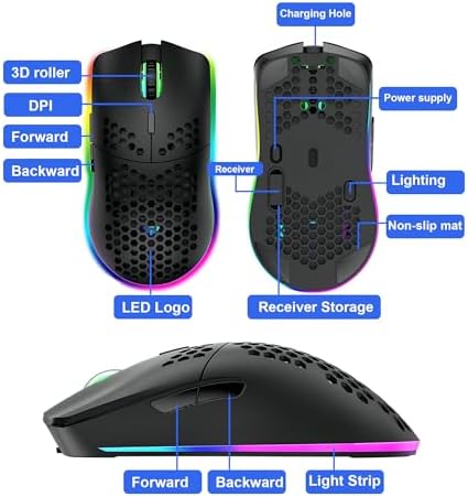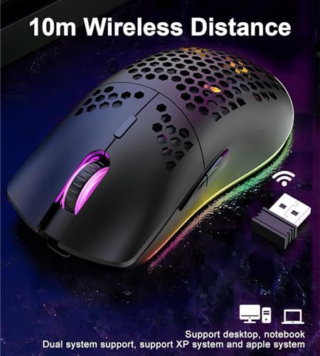 Mengshen Wireless Gaming Mouse Honeycomb, RGB Game Mice with Lightweight Shell High Precision Optical Sensor Adjustable 3200 DPI Ergonomic for Windows PC & Laptop Gamers (Black)