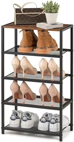 Metal 5 Tier Shoe Rack for Front Door Entrance, Entryway, and Closet Shoe Organizer with 4 Sturdy Metal Mesh Shelves and Wooden Top, Holds 10 Pairs, Ideal for Storage or Display