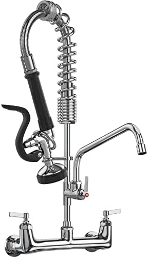 • Commercial Faucet with Sprayer 8 Inch Center 25″ Height Wall Mount Kitchen Sink Faucet Add On 12″ Spout and Pull Down Pre Rinse Sprayer Faucet for 1, 2 or 3 Compartment Sink (Polished Chrome)