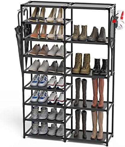 • Tall Garage Shoe Rack Large Capacity,Two Rows Versatile Hooks Storage Boot Shelf Black 24-35 Pairs