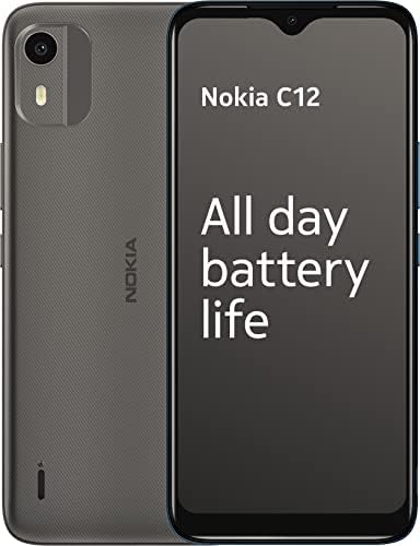 • Nokia C12 6.3” HD+ Dual SIM Smartphone, Android 12 (Go edition), Octa-core 2GB RAM/64GB ROM, 8MP Rear /5MP Front Cameras, Night & Portrait modes, IP52 Rating, 3000mAh Battery – Charcoal