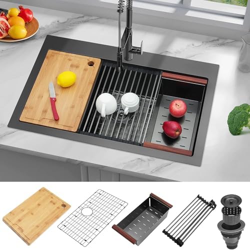 • Black Kitchen Sink, 33 x 22 Drop In Kitchen Sink, 33 Inch Workstation Sink With Accessories, 33″ x 22″ x 9″ Stainless Steel Single Bowl Handmade Large and Deep Kitchen Sinks