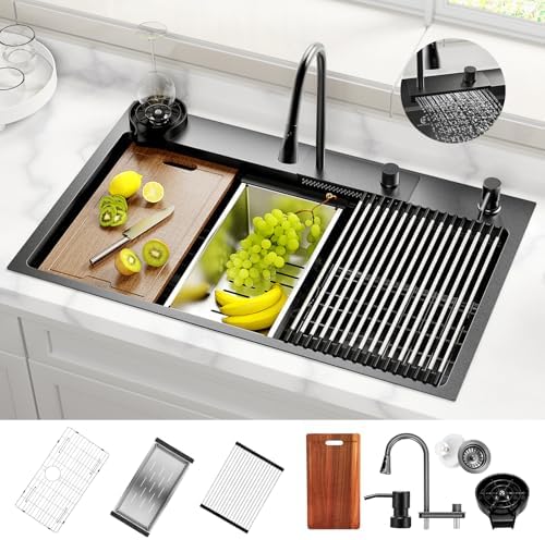 • 33×22 Waterfall Kitchen Sink with Faucet Black Drop in Single Bowl Kitchen Sinks 16 Gauge Stainless Steel Luxury Kitchen Workstation with 8 Accessory Include Glass Rinser and Soap Dispenser