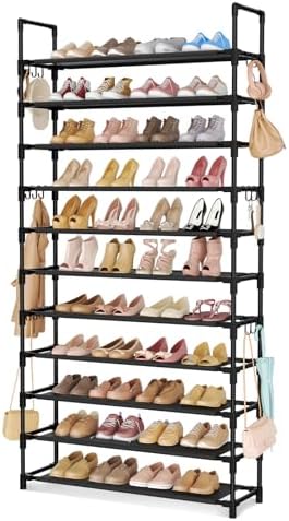 • 11 Tiers Tall Shoe Rack Holds 55 Pairs of Shoes with 18pcs Hooks Sturdy Wide Shoe Organizer Storage Free Standing Metal Shoe Shelf for Closet, Entryway Black