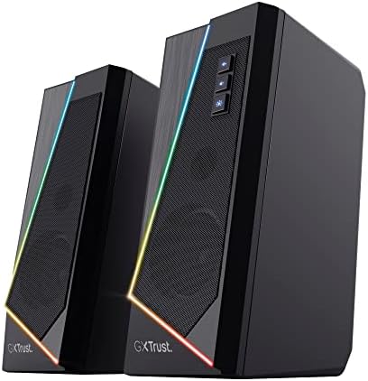 • Trust Gaming GXT 609 Zoxa 2.0 PC Speakers, 12 W Peak Power, RGB Illuminated Set, USB Powered Sound System, 3.5 mm Aux, Volume Control, Stereo Computer Speakers for Desktop and Laptop – Black