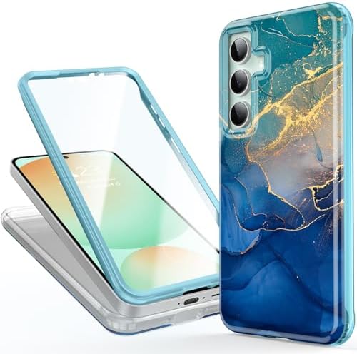 • Esdot for Samsung Galaxy S24 FE Case with Built-in Screen Protector – Durable Hard PC Front Frame + Soft TPU Back Cover, Trendy Cute Designs for Women,Protective Phone Case – Teal Blue Gold Marble