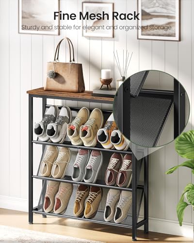 Shoe Rack, 4-Tier Slanted Shoe Storage Shelf, Narrow Shoe Rack for Entryway, Shoe Organizer with Adjustable Feet, Slim Shoe Shelf with Wooden Top and Metal Frame Rustic Brown and Black TXJ75BF