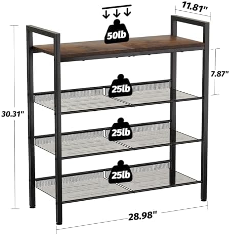 ?Sturdy Shoe Rack for Entryway?Crafted from a robust metal frame and high-quality particle board, this entryway shoe rack can support up to 50 lbs on the top and 25 lbs on each shelf. The dense mesh design ensures that even high heels won’t fall through. Additionally, it features adjustable feet for stability on uneven floors and raised back edges to prevent shoes from rubbing against the wall.