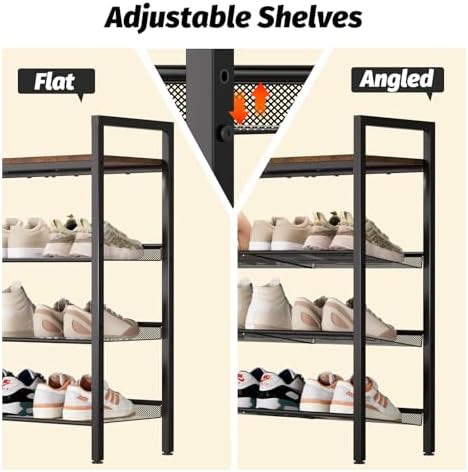 ?Adjustable Shoe Shelf?Each shelf can be placed flat or angled by mounting it to different screw holes on the side frames, allowing you to store and display your shoes in a way that suits your preference. Whether you prefer a neat, uniform look or a more dynamic, angled display, this shoe rack offers the flexibility to meet your needs.