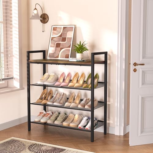 Shoe Rack for Front Door Entrance, 4 Tier Shoe Rack for Entryway, 12-16 Pairs of Shoes, Metal Shoe Rack Organizer, Free Standing Shoe Rack for Closet (Black+Rustic Brown)