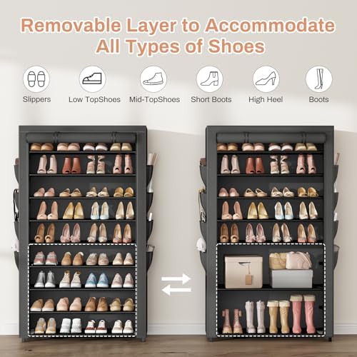 Shoe Rack with Cover, 10 Tier Shoe Organizer Storage for 40-50 Pairs Sneaker and Boots, Large Capacity, with 8 Pockets, Free Standing Tall Shoe Rack for Front Door Entrance, Closet