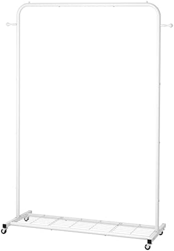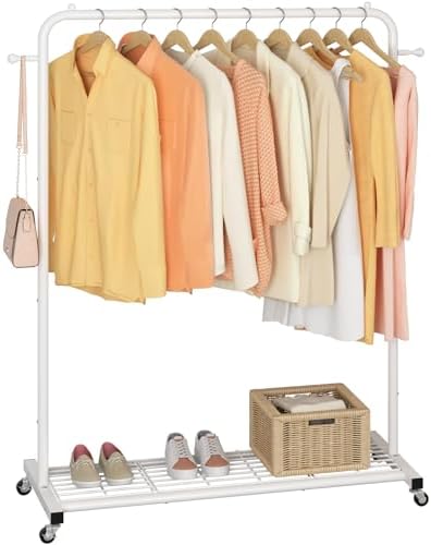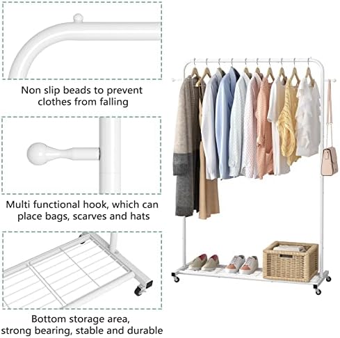 Sywhitta Clothing Rack on Wheels with Mesh Storage Shelf & Sturdy Metal Frame, Rolling Garment Rack for Hanging Clothes, Coats, Skirts, 39.76″ L x 16″ W x 64.56″ H,White