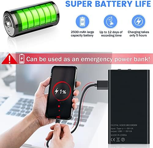 32GB large internal memory: Up to 156 hours recording files capacity, it meets your daily recording requirement, and also can be an MP3 player. 2500mAh battery can record continuously for 12 days (288 hours). Time for a full recharge: about 5 hours.