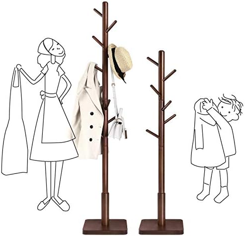 Product description Specifications: Color: Dark Walnut Material: Rubberwood Hooks and Main Pole, MDF (Medium Density Fiberboard) BaseProduct Size: 11.8″D x 11.8″W x 68.9″H (30 x 30 x 175 cm)Product Weight: 8.6 lb (3.9 kg)Max. Overall Static Load Capacity: 53 lb (24 kg) Package Contents: 1 x Coat Rack1 x Accessory
