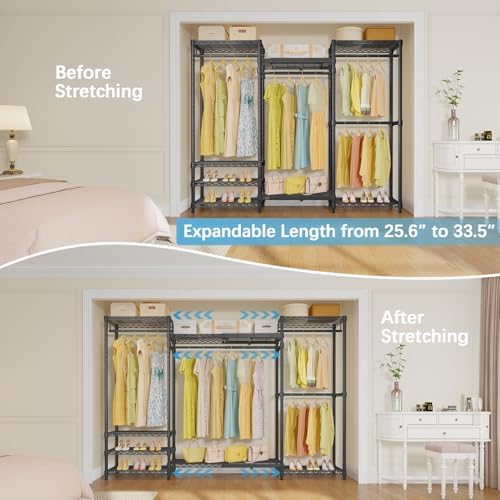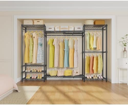 Product description Walk-in Closet Rack: Meet the VIPEK Expendable Clothes Rack, the latest member of the VIPEK V5 Series, designed to offer expansive storage for clothes, accessories, shoes, and more—a wardrobe you’ll adore for years to come.Maximize Your Space: With 2 expandable closet shelves and 1 expendable hanging rod, the