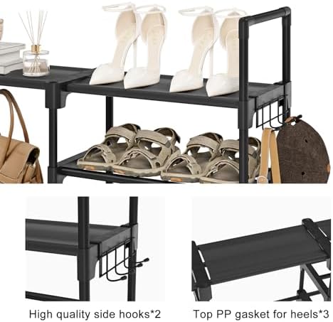 9-Tier Shoe Rack:Featuring a compact profile, you can easily set this shoe rack in the hallway, living room, bedroom,or garage. It helps you maximize your vertical space while saving more floor space for other items.The product is designed to be disassembled and assembled freely. You can remove the five layers to store boots, high heels or other larger accessories to suit different scenarios