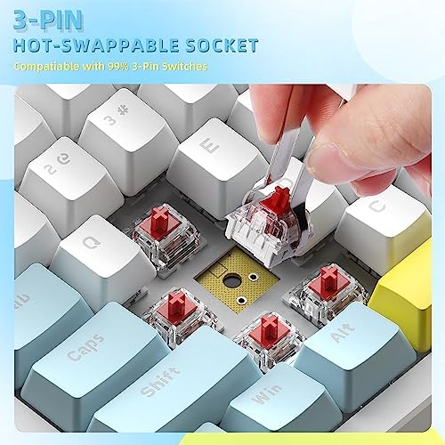 ?Hot Swappable & Linear Red Switches?The hot swappable PCB allows you to replace 3 Pin switches without soldering and replace the keycaps.With a free switch puller/keycap puller for easy removal.Fully customize your own unique keyboard.Linear Red Switches can give you the quietest,purest mechanical experience.Gamers who need to double-click or triple-click the keyboard in a row can get a speed advantage.